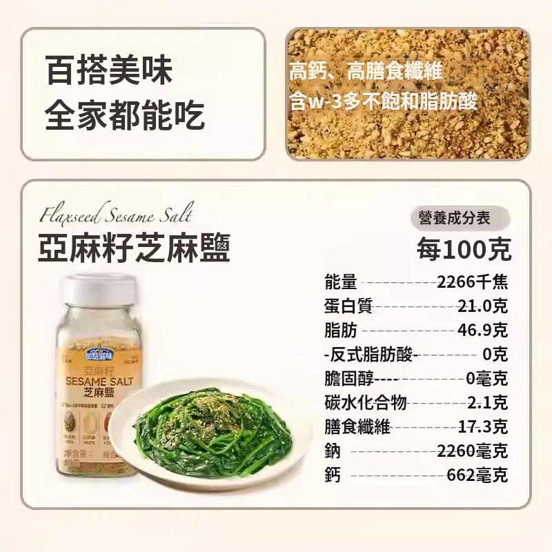 20分鐘前【熱銷】亞麻籽芝麻鹽 减肥人士必備 水煮菜的靈魂 多重口感 增香调味 轻食控卡 0負擔0添加!! - 【破盤嗨購】買三送四 7入組 NT$1398